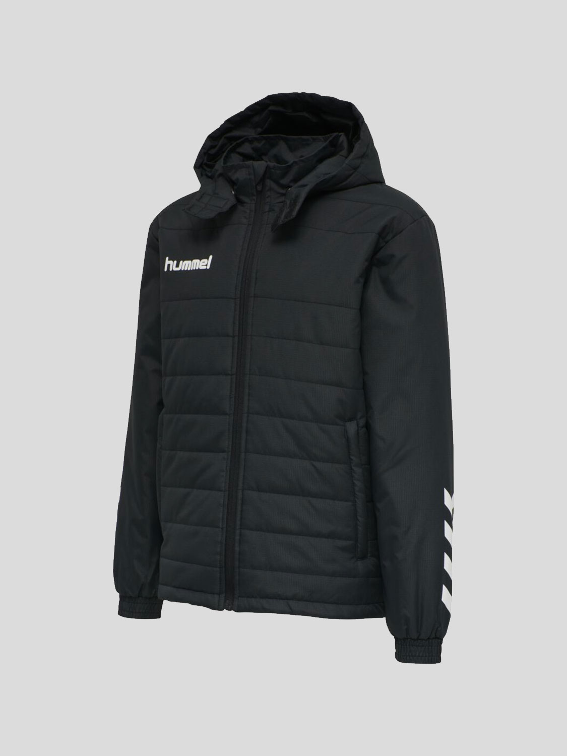 hmlPROMO BENCH trumpa vaikiška striukė su gobtuvu, priekyje užsegama užrauktuku. Šonuose yra kišenės užsegamos užtrauktukais.